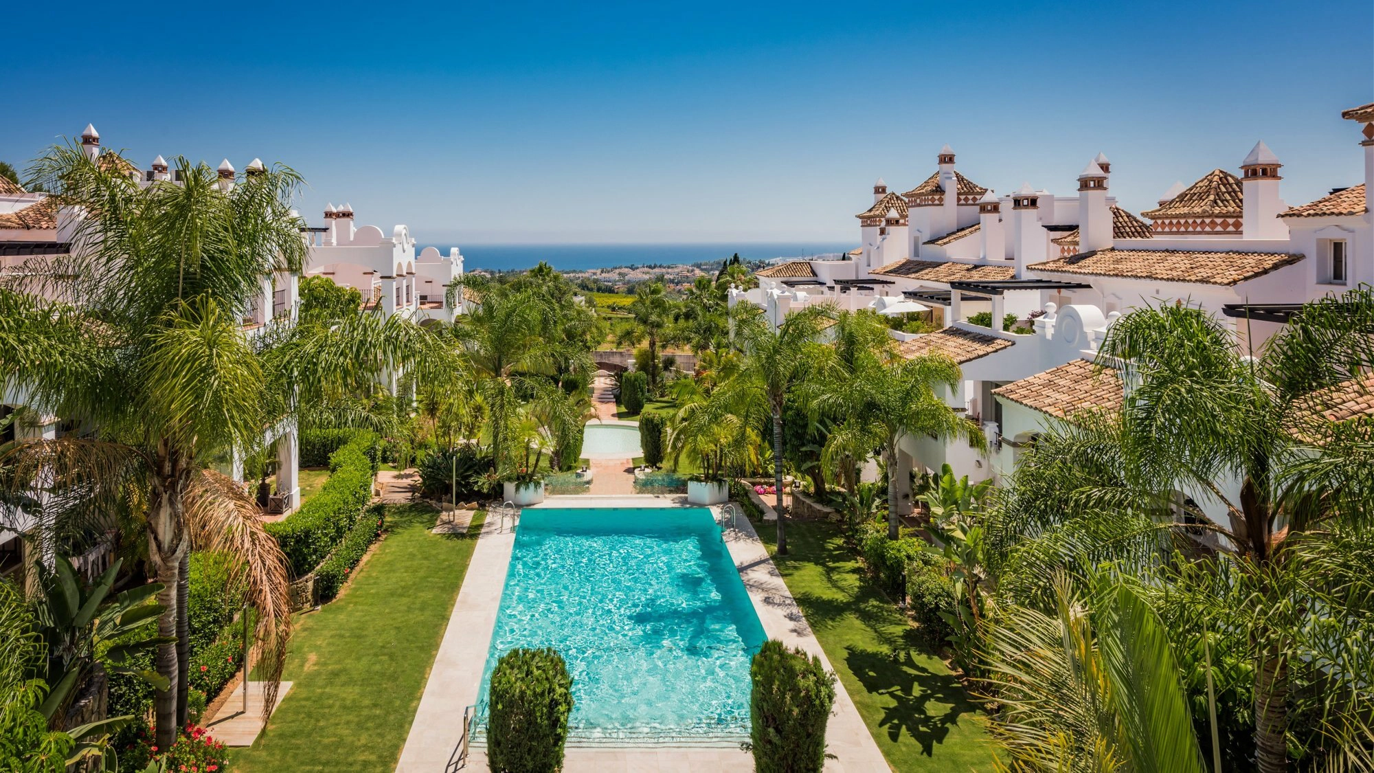 This exceptional property is set on a generous, elevated plot of 7,200 m² in the exclusive, gated Cascada de Camoján community in Marbella and offers breathtaking views of the Mediterranean Sea. The impressive luxury residence consists of three separate properties: the four-bedroom main house, an adjoining, connected seven-bedroom guest house, and a self-contained four-bedroom guest finca with its own tennis court.